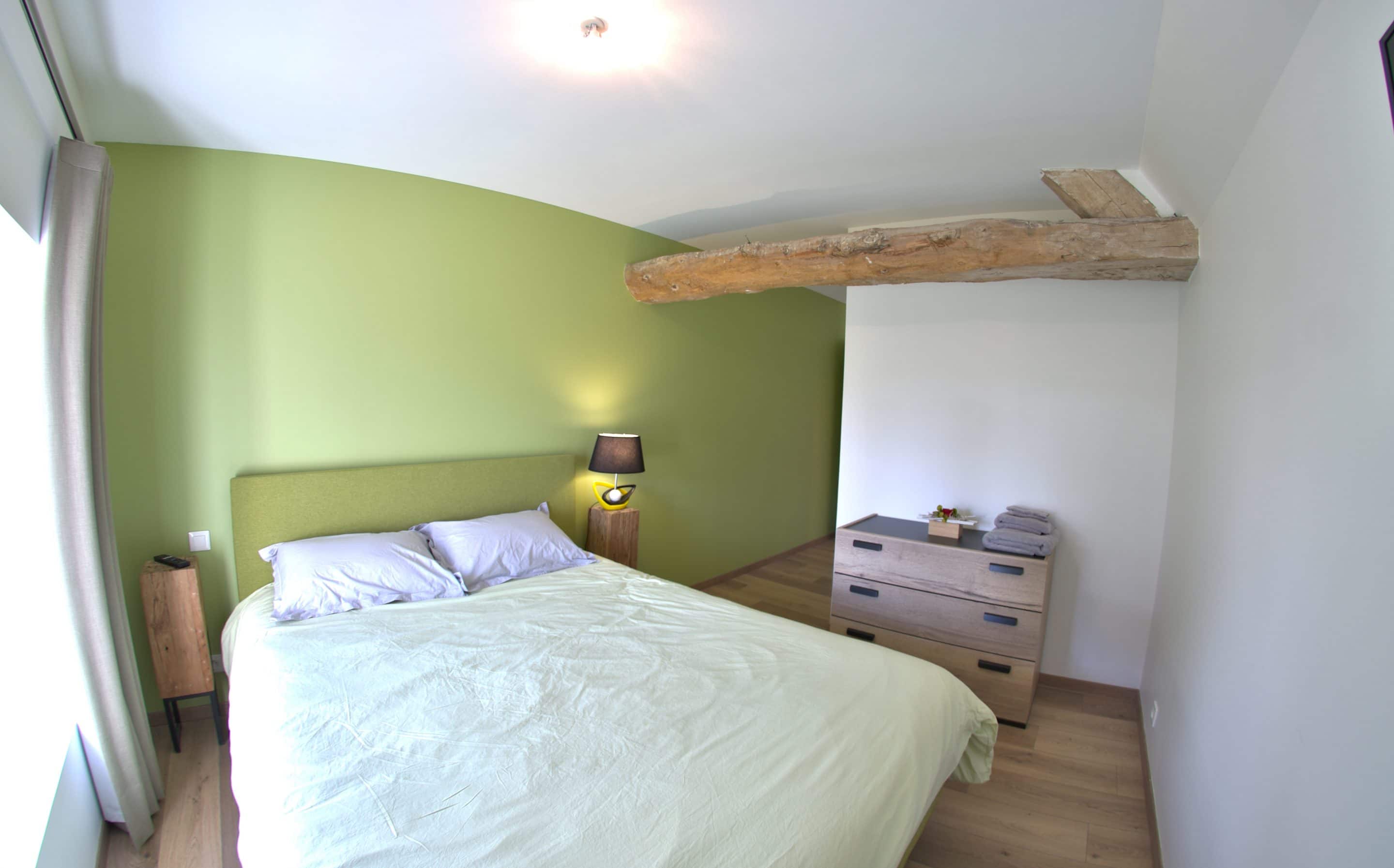 Chambre composé d’un lit double, d’un lit superposé, d’un TV et d’une salle de bain privative